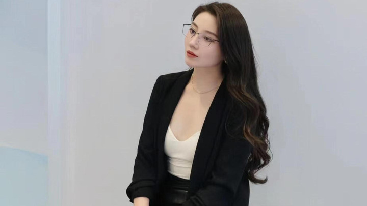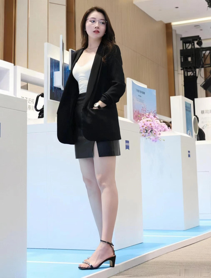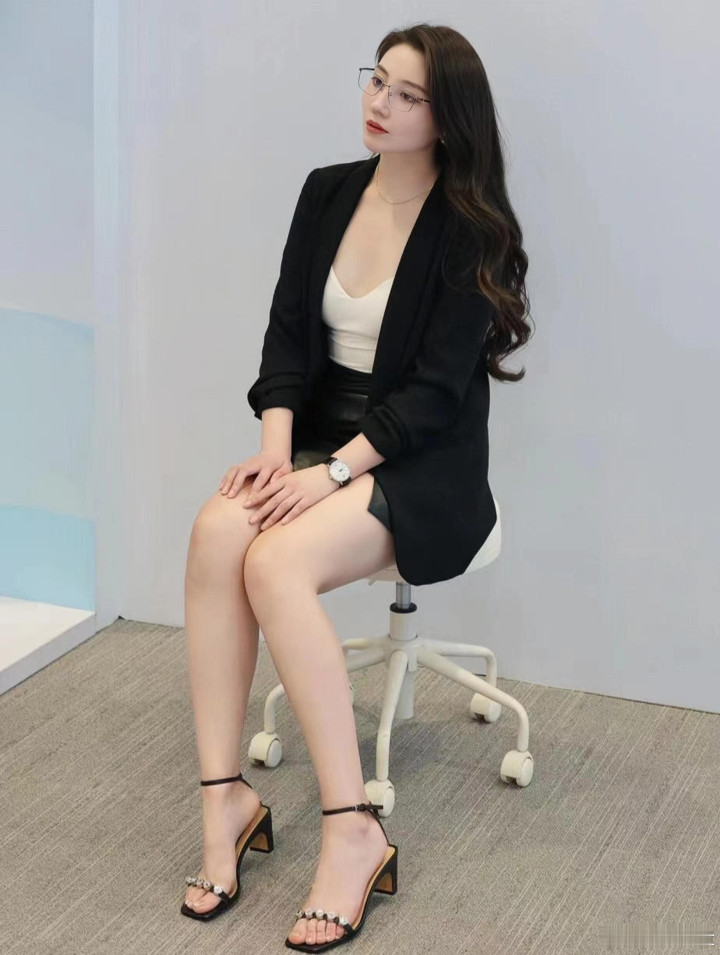 她身着黑色西装外套,搭配简约白色内搭,展现出完美的身材比例。黑色高跟鞋更添优雅气质,整体造型既时尚又专业,完美诠释了现代女性的自信与魅力。